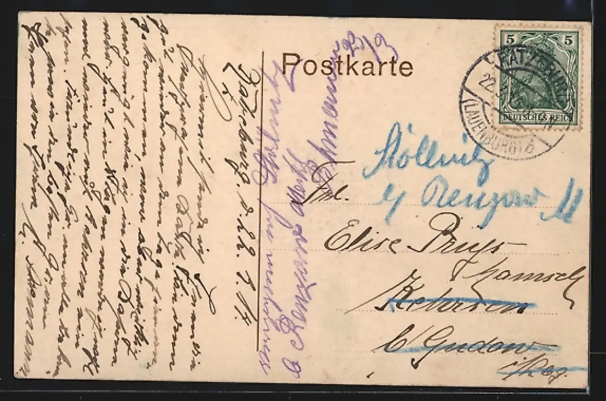 Personenbezogene Daten auf der Rückseite der Karte wurden durch blauen Textmarker unkenntlich gemacht. Die blauen Stellen sind auf die Vorderseite durchgeweicht und wirken sich negativ auf das Postkartenfoto aus