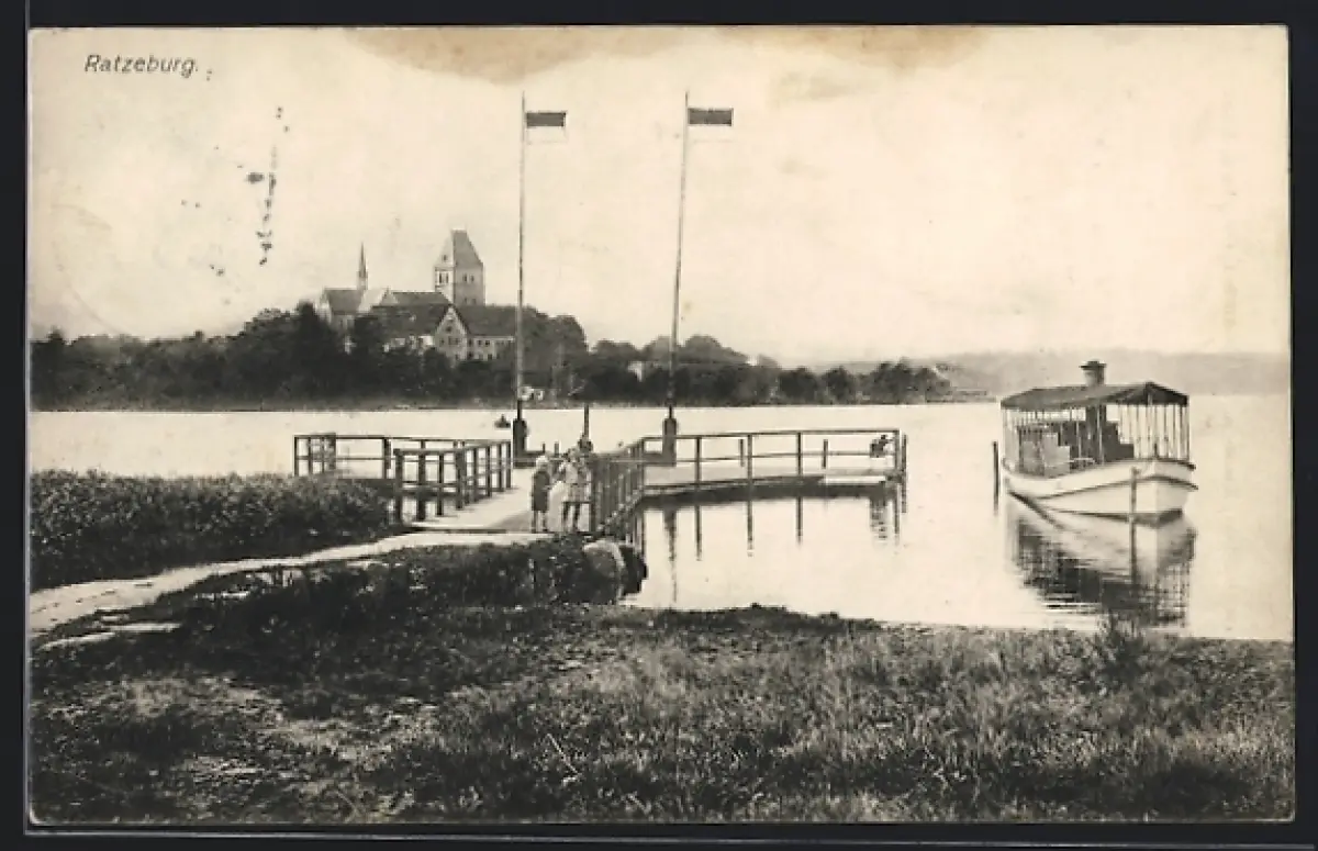 AK Ratzeburg, Steg mit Ausflugsboot und Dom im Hintergrund