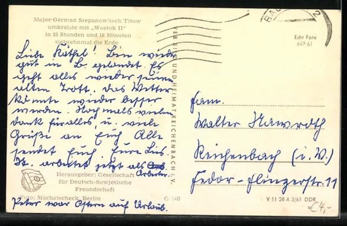 AK Raumfahrt der UDSSR, Major G. S. Titow umkreiste mit Wostok II die Erde, 7.8.1961