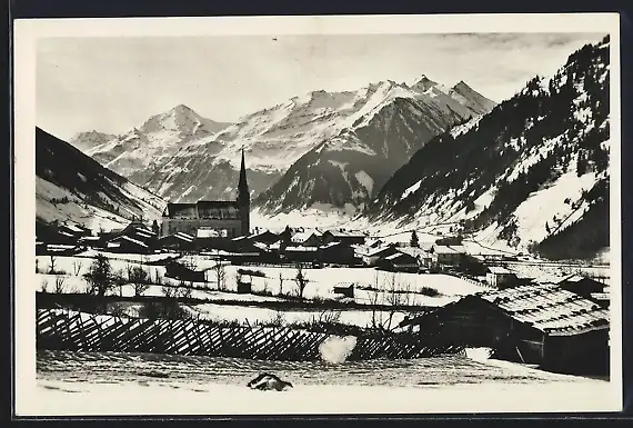 AK Rauris, Ortsansicht im Winter gegen Sonnblick