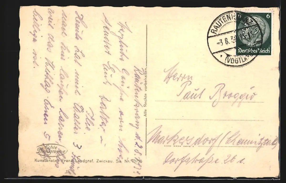 Personenbezogene Daten auf der Rückseite der Karte wurden durch blauen Textmarker unkenntlich gemacht. Die blauen Stellen sind auf die Vorderseite durchgeweicht und wirken sich negativ auf das Postkartenfoto aus