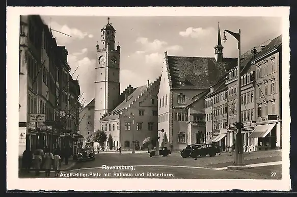 AK Ravensburg, Strasse mit Rathaus u. Blaserturm