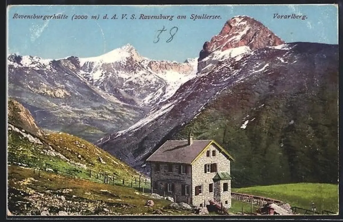AK Ravensburgerhütte am Spullersee, Berghütte mit Gipfelpanorama