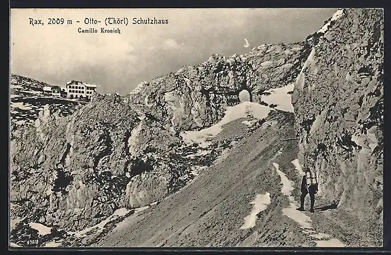 AK Rax, Otto-Thörl-Schutzhaus, Camillo Kronich, Wanderer auf dem Weg zum Schutzhaus