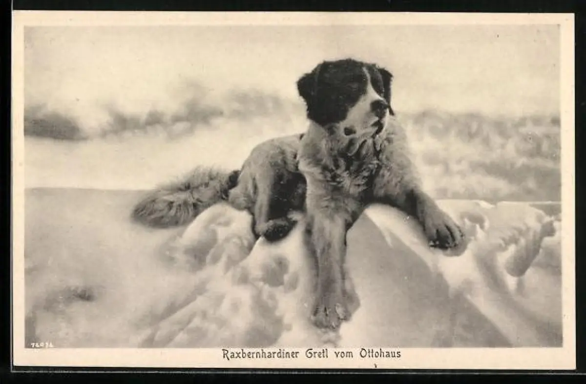 AK Raxbernhardiner Gretl vom Ottohaus im Schnee sitzend