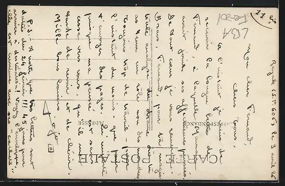 Personenbezogene Daten auf der Rückseite der Karte wurden durch blauen Textmarker unkenntlich gemacht. Die blauen Stellen sind auf die Vorderseite durchgeweicht und wirken sich negativ auf das Postkartenfoto aus