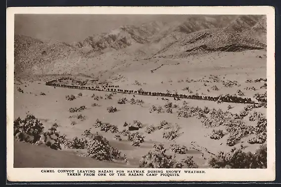AK Razani, Camel Convoy leaving Razani for Raymak during snowy weather