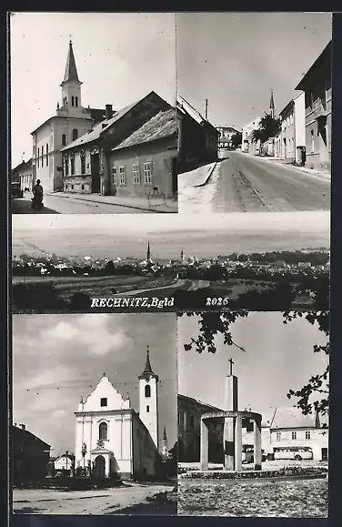 AK Rechnitz, Denkmal, Kirchen, Strassenpartie
