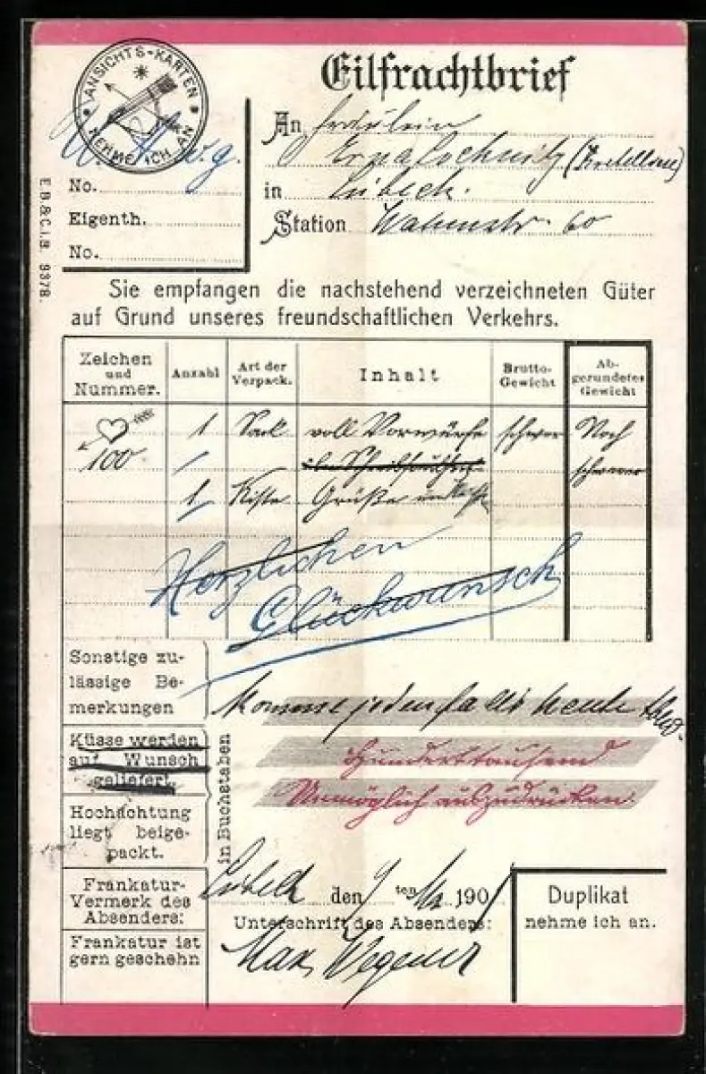 AK Rechnung eines Eilfrachtbriefs für Ansichts-Karten