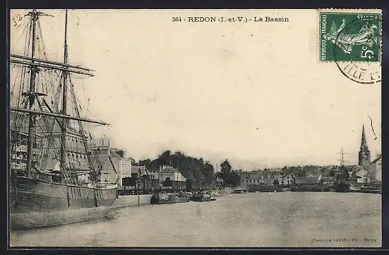 AK Redon, Le Bassin avec voiliers et vue sur la ville