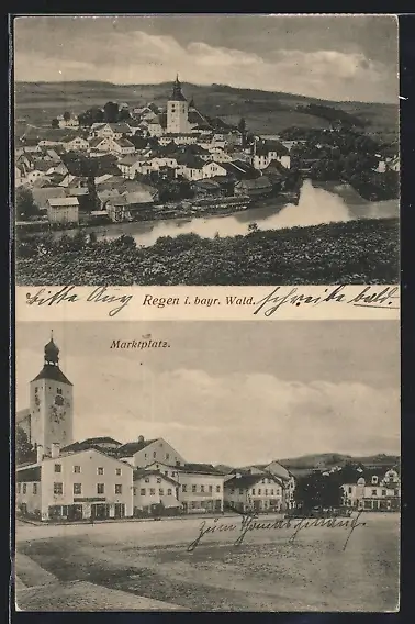 AK Regen i. bayr. Wald, Marktplatz, Panoramablick auf den Ort