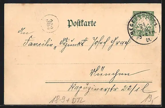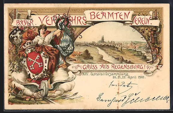 AK Regensburg, Generalversammlg. Bayr. Verkehrsbeamten-Verein 1901, Stadtpanorama, Wappen, Ganzsache Bayern