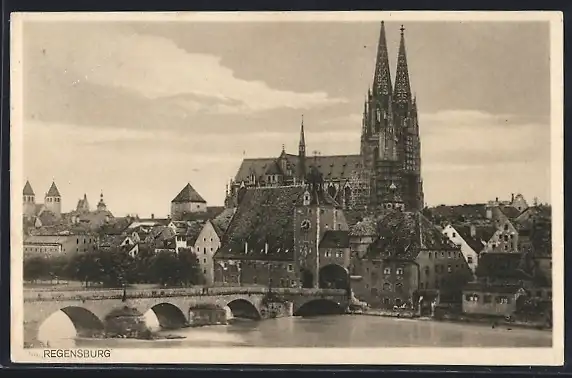 AK Regensburg, Stadtpanorama mit Brücke u. Dom