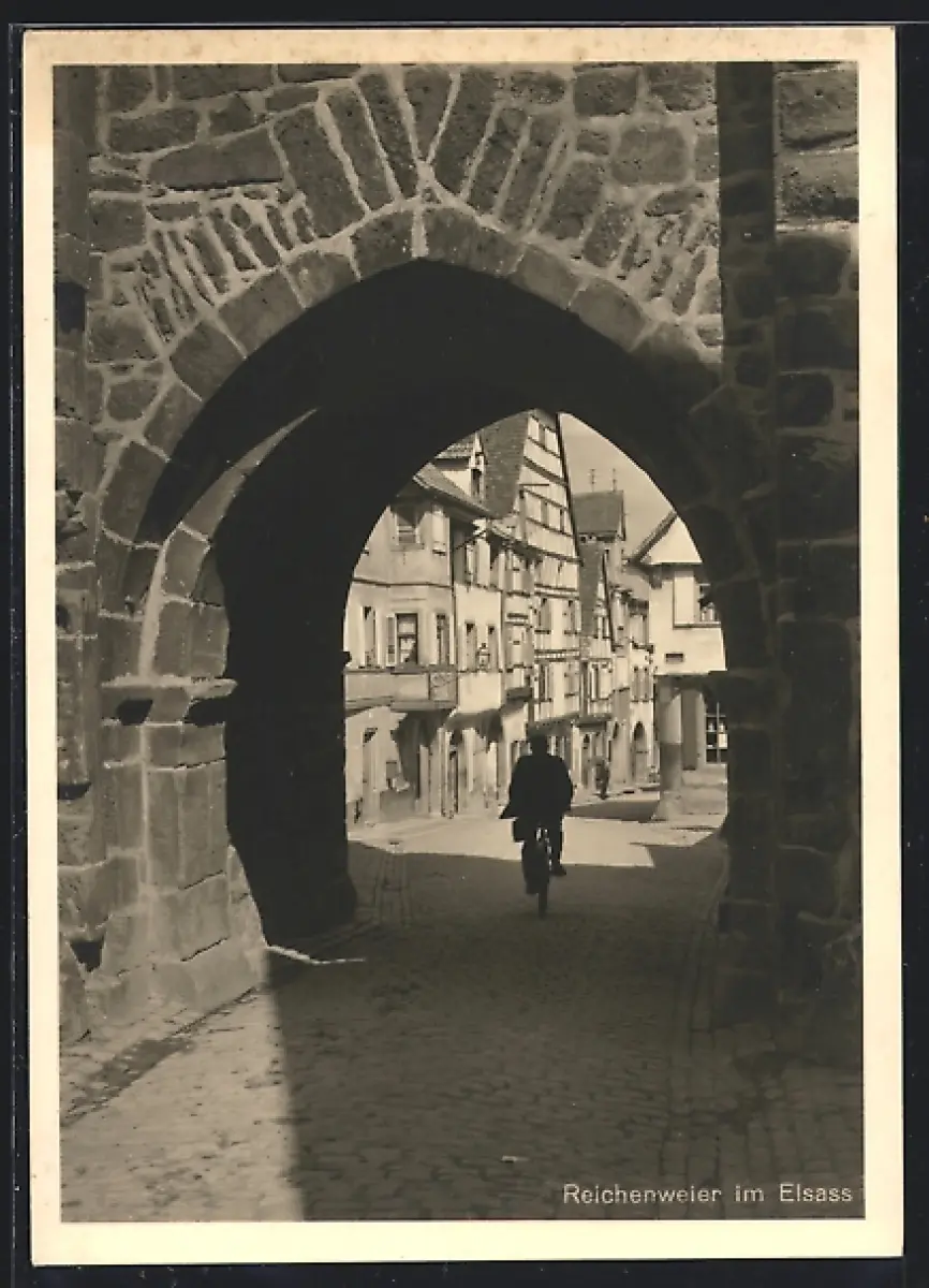 AK Reichenweier im Elsass, Fahrradfahrer im Torbogen