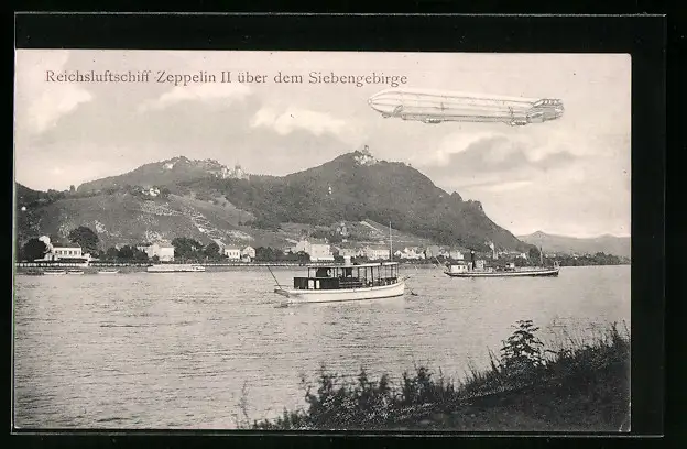 AK Reichsluftschiff Zeppelin II über dem Siebengebirge, mit Rhein und Rheindampfern