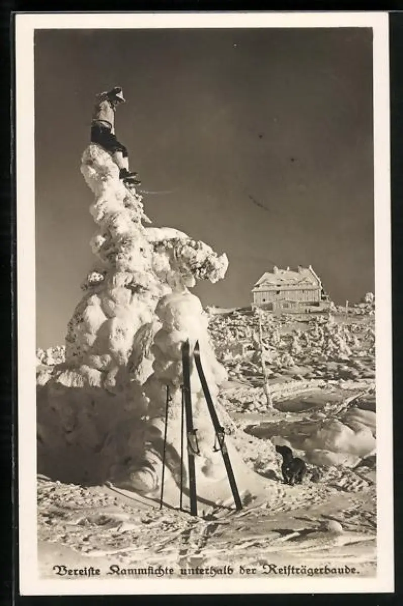 AK Reifträgerbaude mit vereister Kammfichte und Skifahrer