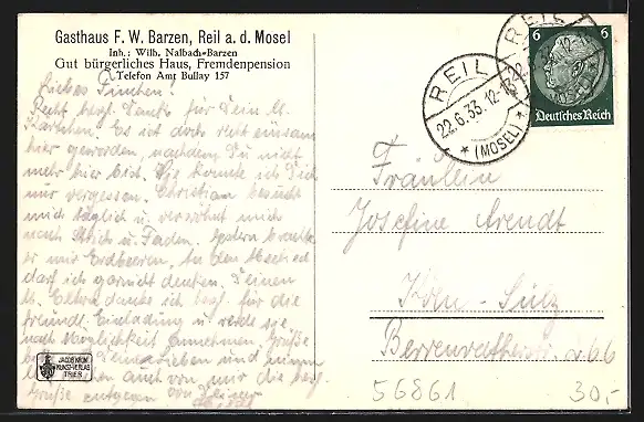 AK Reil a. d. Mosel, Gasthaus F. W. Barzen von W. Nalbach-Barzen