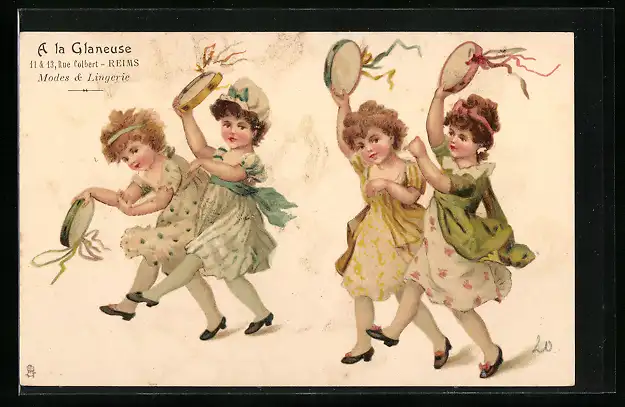 AK Reims, A la Glaneuse, Tanzende Mädchen in bunten Kleidern