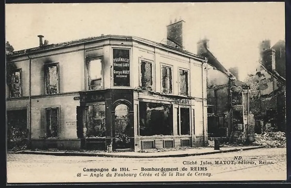 AK Reims, Angle du Faubourg Cérès et de la Rue de Cernay, Bombardement de 1914