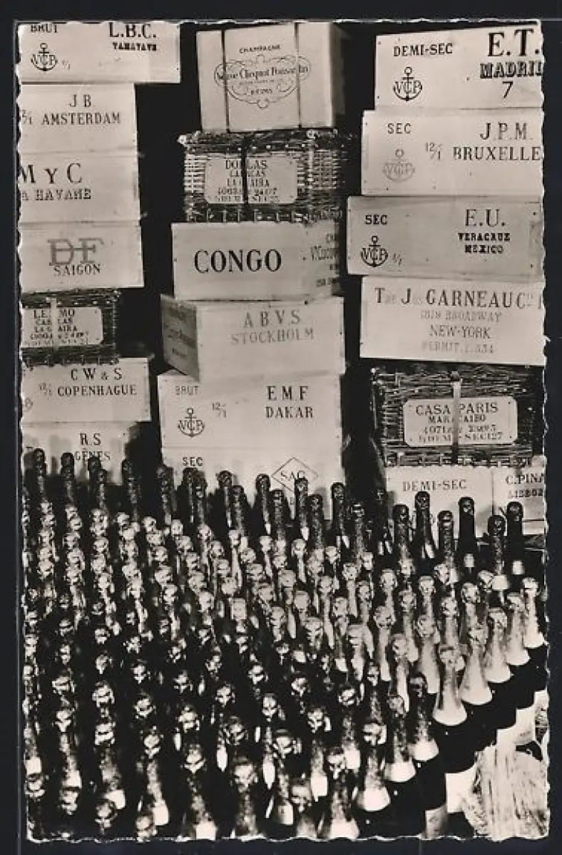 AK Reims, Champagne, Veuve Clicquot-Ponsardin, Départ pour les coins du monde, Sektflaschen neben Kisten