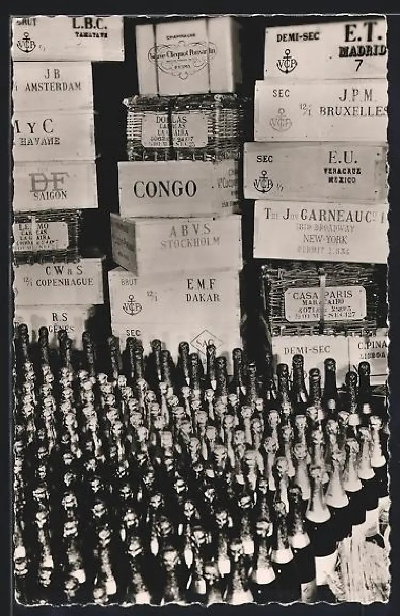 AK Reims, Champagne, Veuve Clicquot-Ponsardin, Départ pour tous les coins du monde, Sektflaschen neben Kisten
