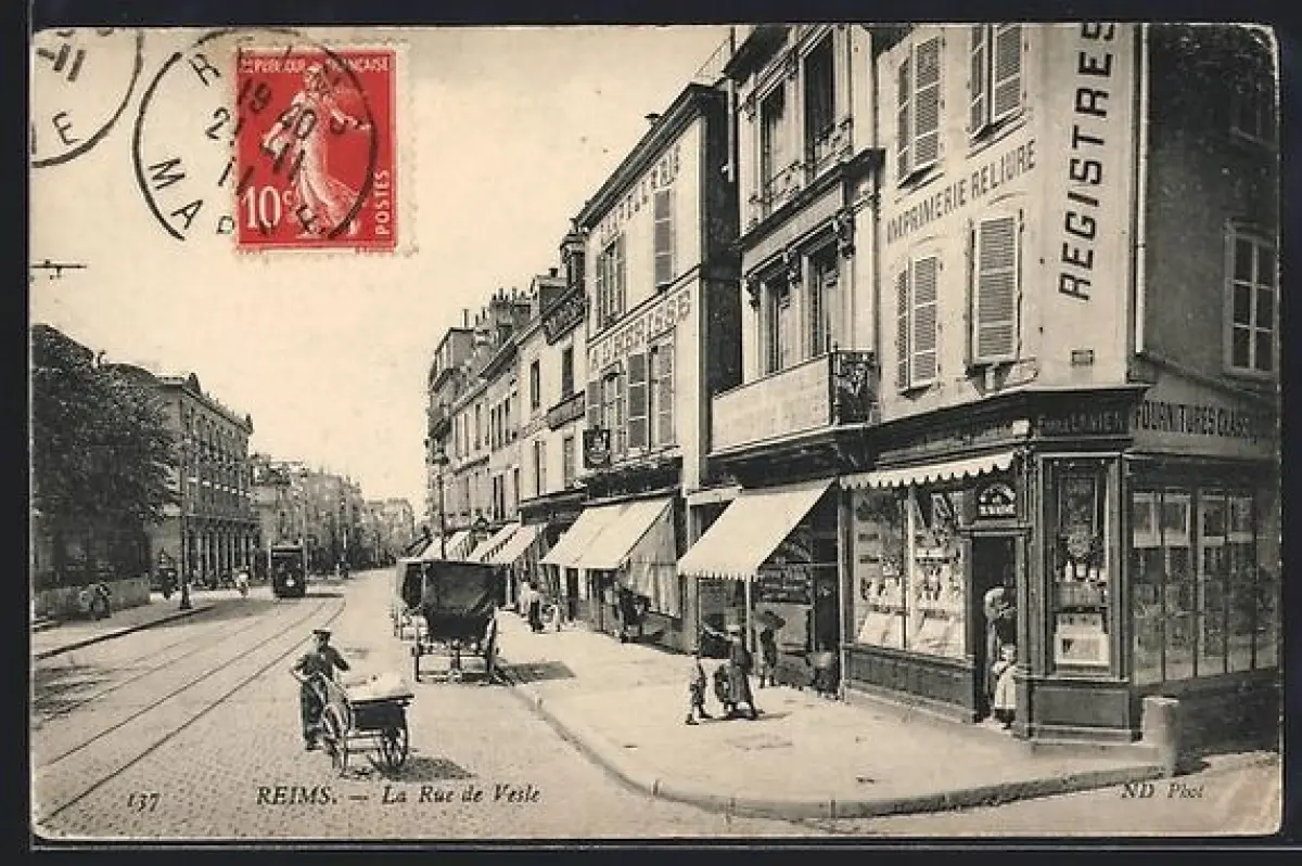 AK Reims, La Rue de Vesle avec boutiques et tramway circulant sur la voie