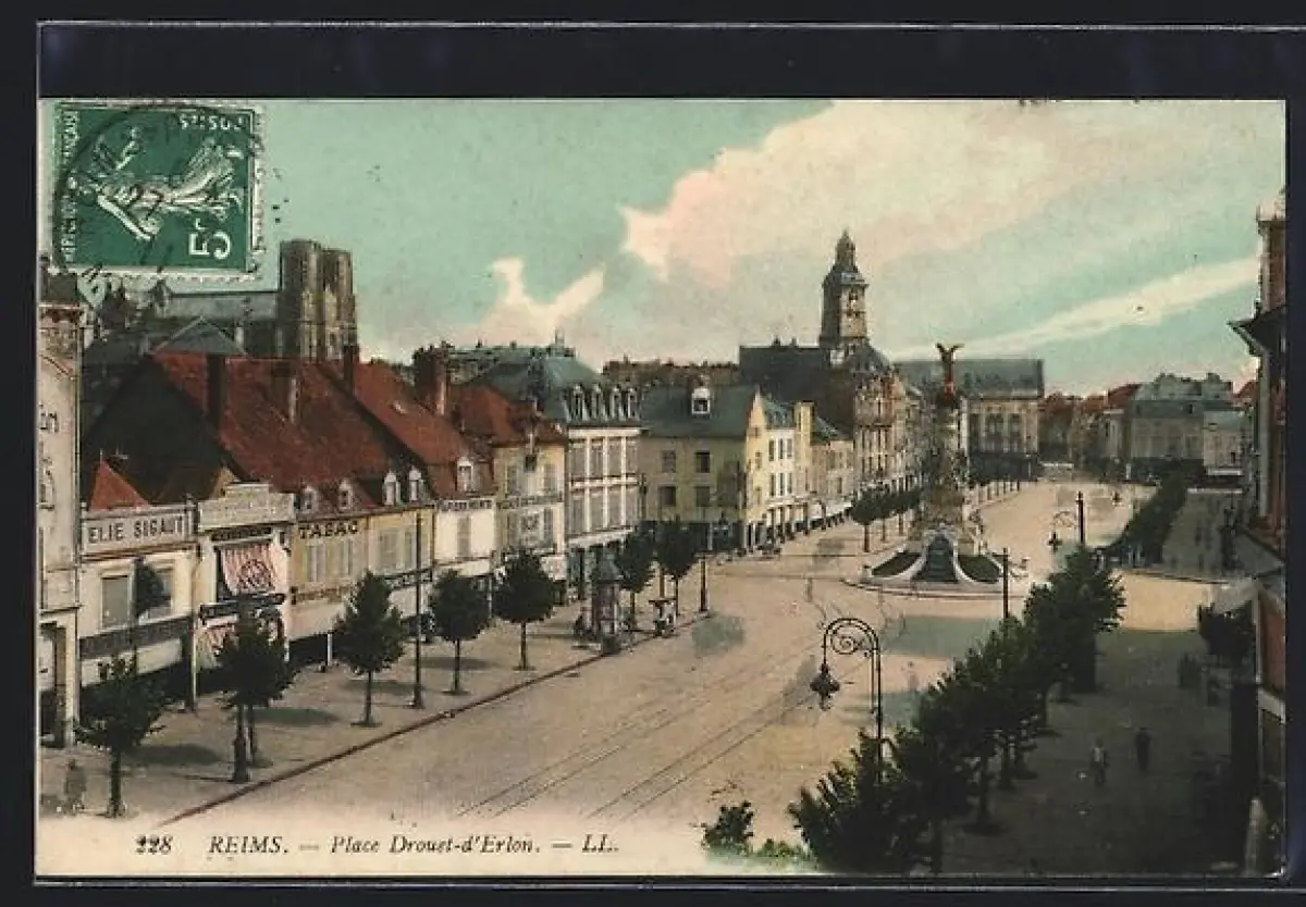 AK Reims, Place Drouet-d`Erlon avec statue et bâtiments environnants