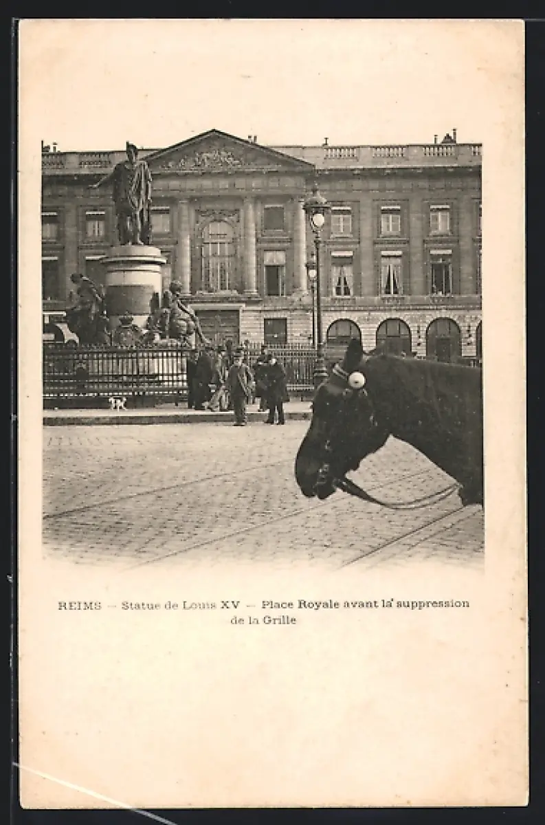 AK Reims, Statue de Louis XV, Place Royale avant la suppression de la Grille