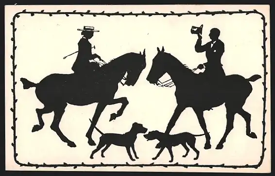 AK Reiter zieht den Hut vor einer Reiterin zu Pferde, Hunde, Scherenschnitt