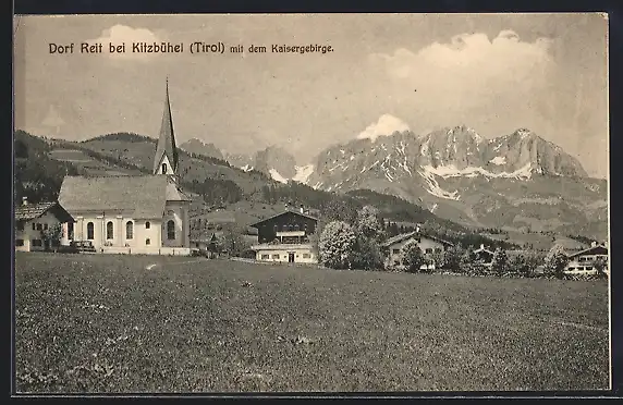 AK Reith bei Kitzbühel, Kirche mit dem Kaisergebirge