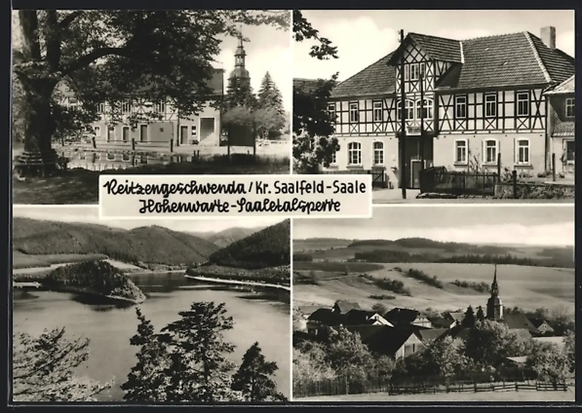 AK Reitzengeschwenda /Saalfeld, Kirche, Fachwerkhaus, Hohenwarte-Saaletalsperre