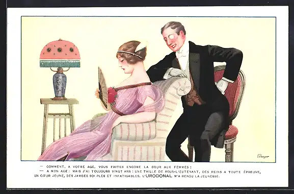 AK Reklame Medikament Urodonal gegen Nierenkolik, Frau sitzt mit Fächer im Sessel, Mann sitzt auf einem Stuhl hinter ihr