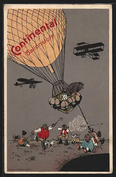 AK Reklame für Continental Ballonstoff, Aufruhr beim Start, Doppeldecker am Himmel