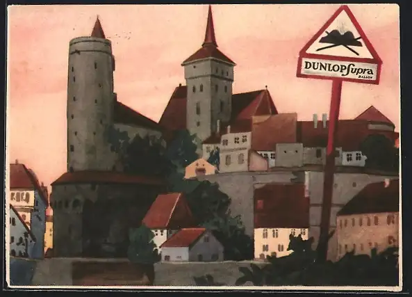 AK Reklame für Dunlop Supra Ballon, Verkehrsschild in mittelalterlichem Ort