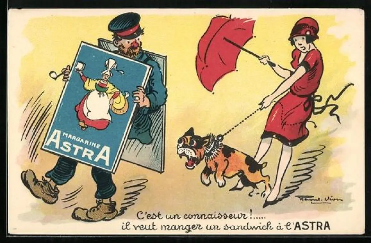 AK Reklame für Margarine Astra, Dame hält ihren Hund von Plakatträger zurück