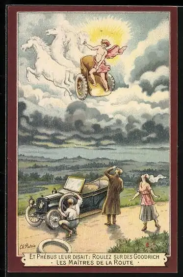 AK ReklameReifen Goodrich, Auto mit Reifenplatten sieht hoch zu Streitwagen mit stabilen Reifen