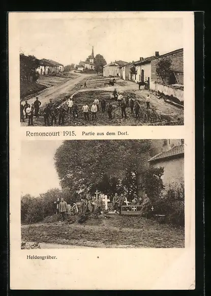 AK Remoncourt, Heldengräber, Strassenpartie mit dt. Soldaten 1915