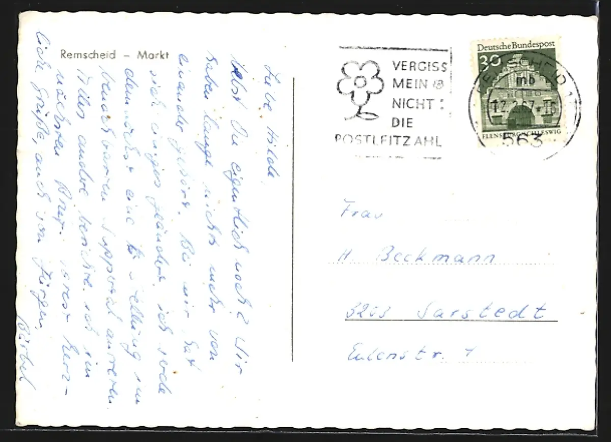 alte Ansichtskarte, gelaufen 1967, Stempelspur, Bugspuren obere Kante und unten mittig, Bugspur rechte Kante