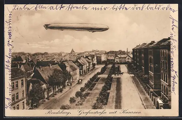 AK Rendsburg, Grafenstrasse mit Kaserne und Zeppelin