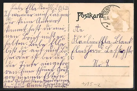 alte Ansichtskarte, gelaufen, Bugspur li. oben, Briefmarke entfernt, rückseitig Oberflächenschaden, guter Zustand