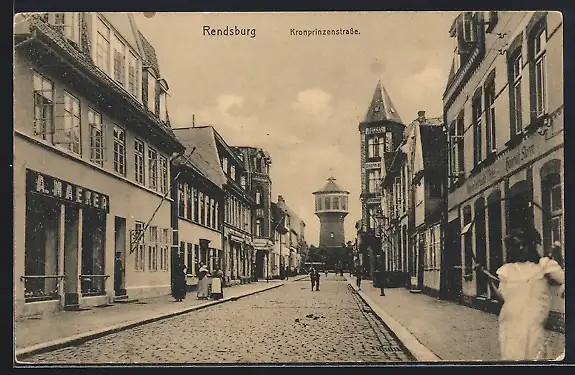 AK Rendsburg, Kronprinzenstrasse m. Blick auf den Wasserturm