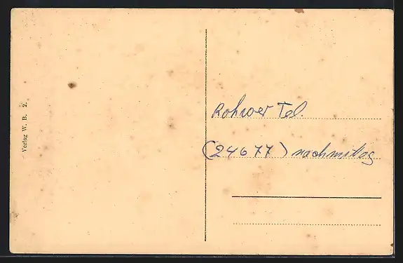 Personenbezogene Daten auf der Rückseite der Karte wurden durch blauen Textmarker unkenntlich gemacht. Die blauen Stellen sind auf die Vorderseite durchgeweicht und wirken sich negativ auf das Postkartenfoto aus