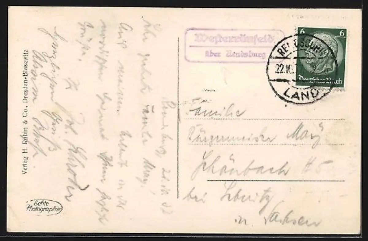 Personenbezogene Daten auf der Rückseite der Karte wurden durch blauen Textmarker unkenntlich gemacht. Die blauen Stellen sind auf die Vorderseite durchgeweicht und wirken sich negativ auf das Postkartenfoto aus