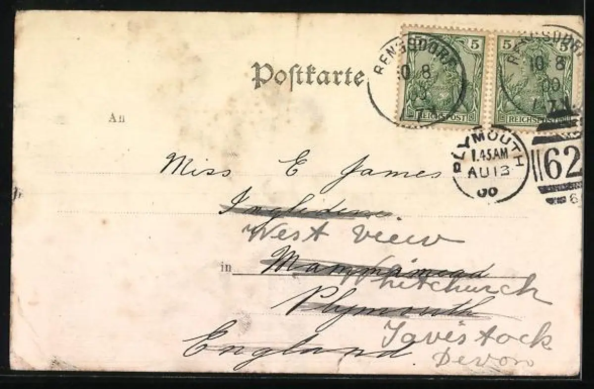 alte Ansichtskarte, gelaufen 1900, Eckknick li. oben und re. unten, guter Zustand