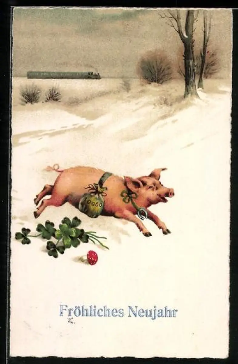 AK Rennendes Schwein mit Geldsack im Schnee, Glücksklee, Fliegenpilz, Neujahrsgruss