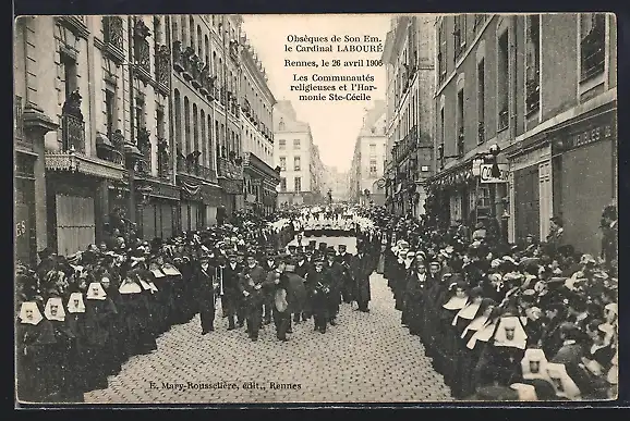 AK Rennes, Obsèques de Son Em. le Cardinal LABOURÉ, 26 avril 1906, Les Communautés religieuses et l`Harmonie Ste-Cécile