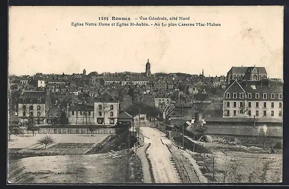 AK Rennes, Vue générale côté Nord, églises Notre-Dame et St-Aubin, caserne Mac-Mahon en arrière-plan