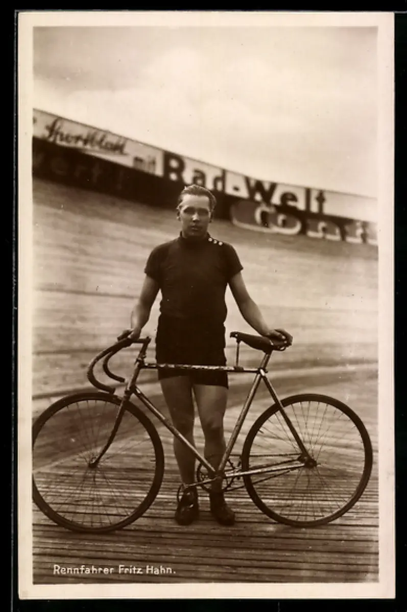 AK Rennfahrer Fritz Hahn mit seinem Rennrad im Stadion