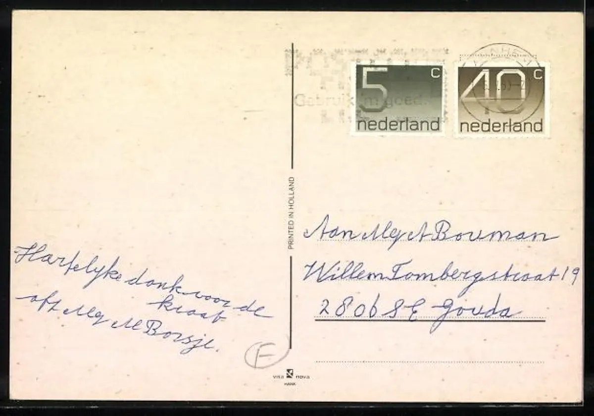 Personenbezogene Daten auf der Rückseite der Karte wurden durch blauen Textmarker unkenntlich gemacht. Die blauen Stellen sind auf die Vorderseite durchgeweicht und wirken sich negativ auf das Postkartenfoto aus