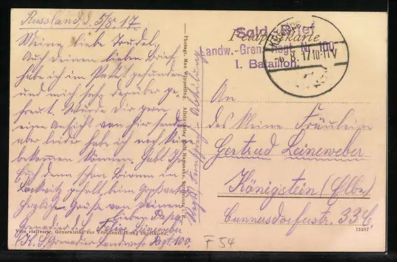 gelaufen als Feldpost 1917, guter Zustand